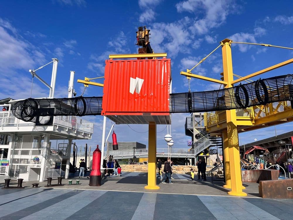 It features authentic artifacts converted to play structures and is designed to engage families and stimulate learning, creativity and imagination. The park is built from repurposed construction and boating equipment, blending fun and learning.